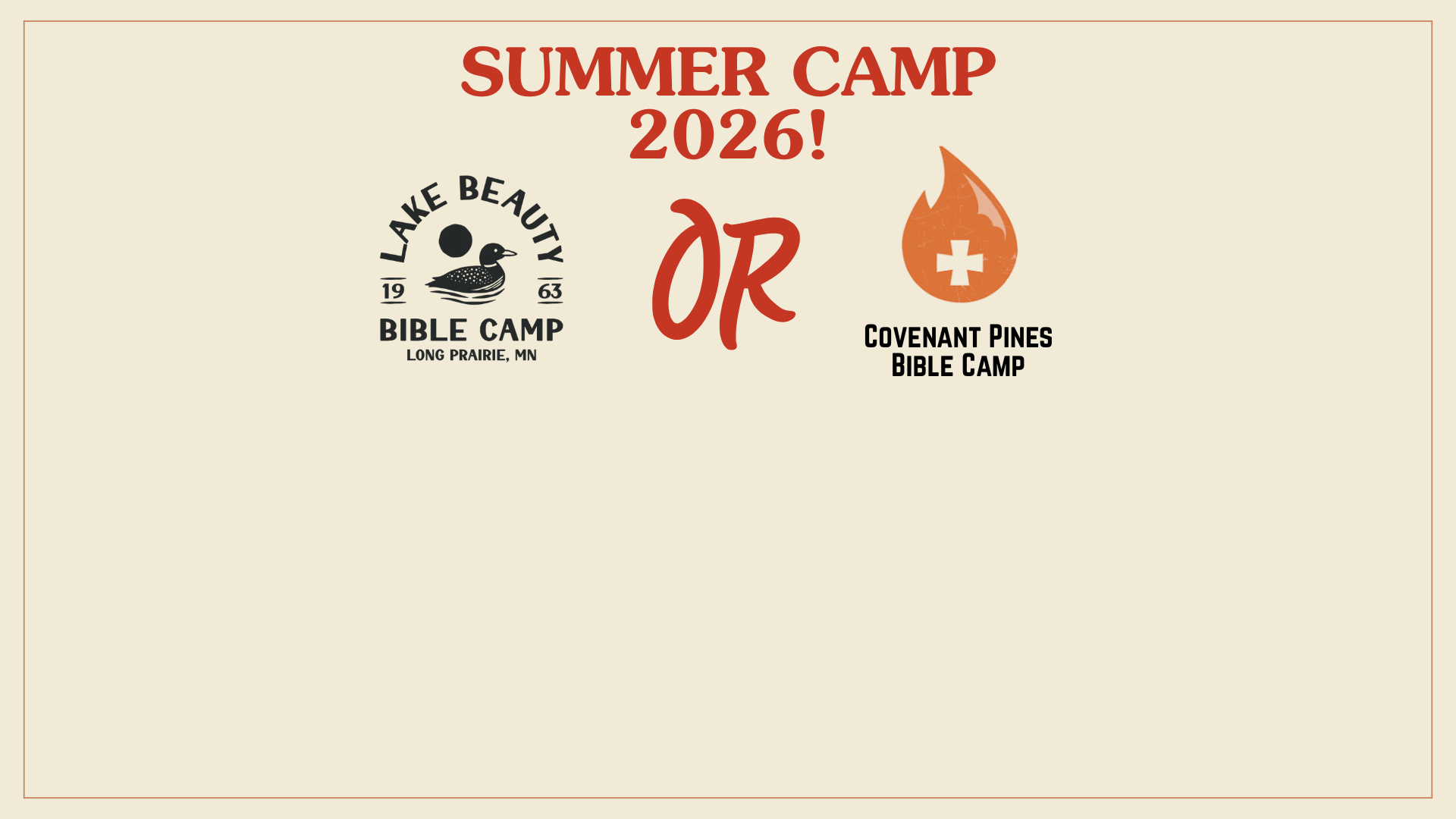 TWO SUMMER CAMP OPTIONS!Children and youth currently in 1st-12th grade are invited to spend some time this summer at either Lake Beauty Bible Camp in Long Prairie, MN, or Covenant Pines Bible Camp in McGregor, MN.OPTION # 1: LAKE BEAUTY BIBLE CAMPFor specific information on camp options for each each age level, visit the Lake Beauty Bible Camp website.